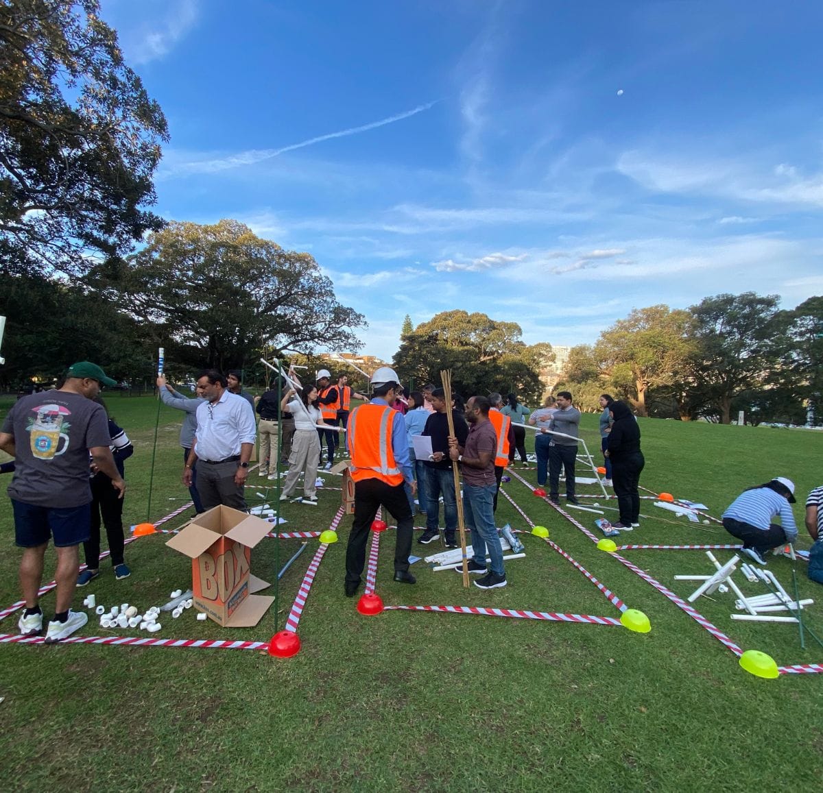 Before breaking ground, teams complete a series of playful skill tests. These activities qualify participants and help determine the best choice of foreman, the only person who can move between zones. Once construction begins, teams must earn and exchange resources, quickly realising that communication and smart problem solving are essential.